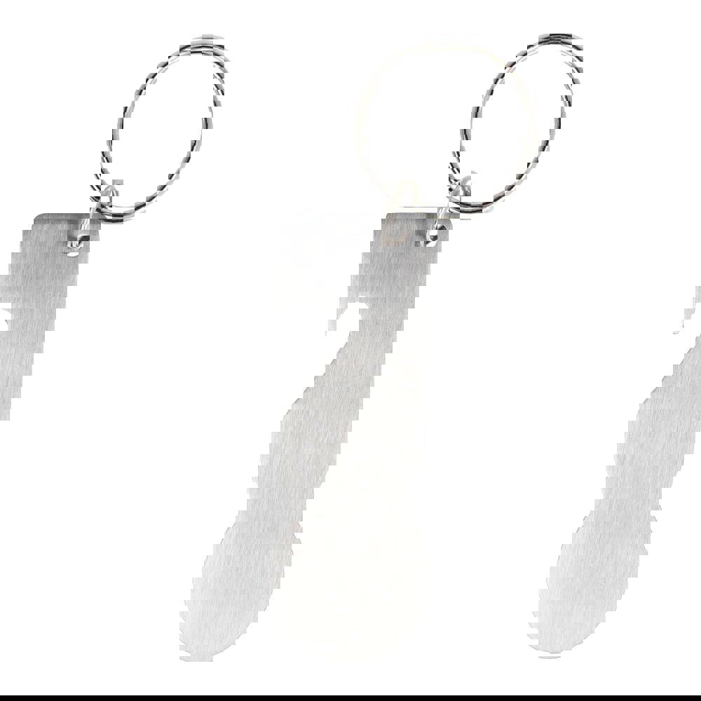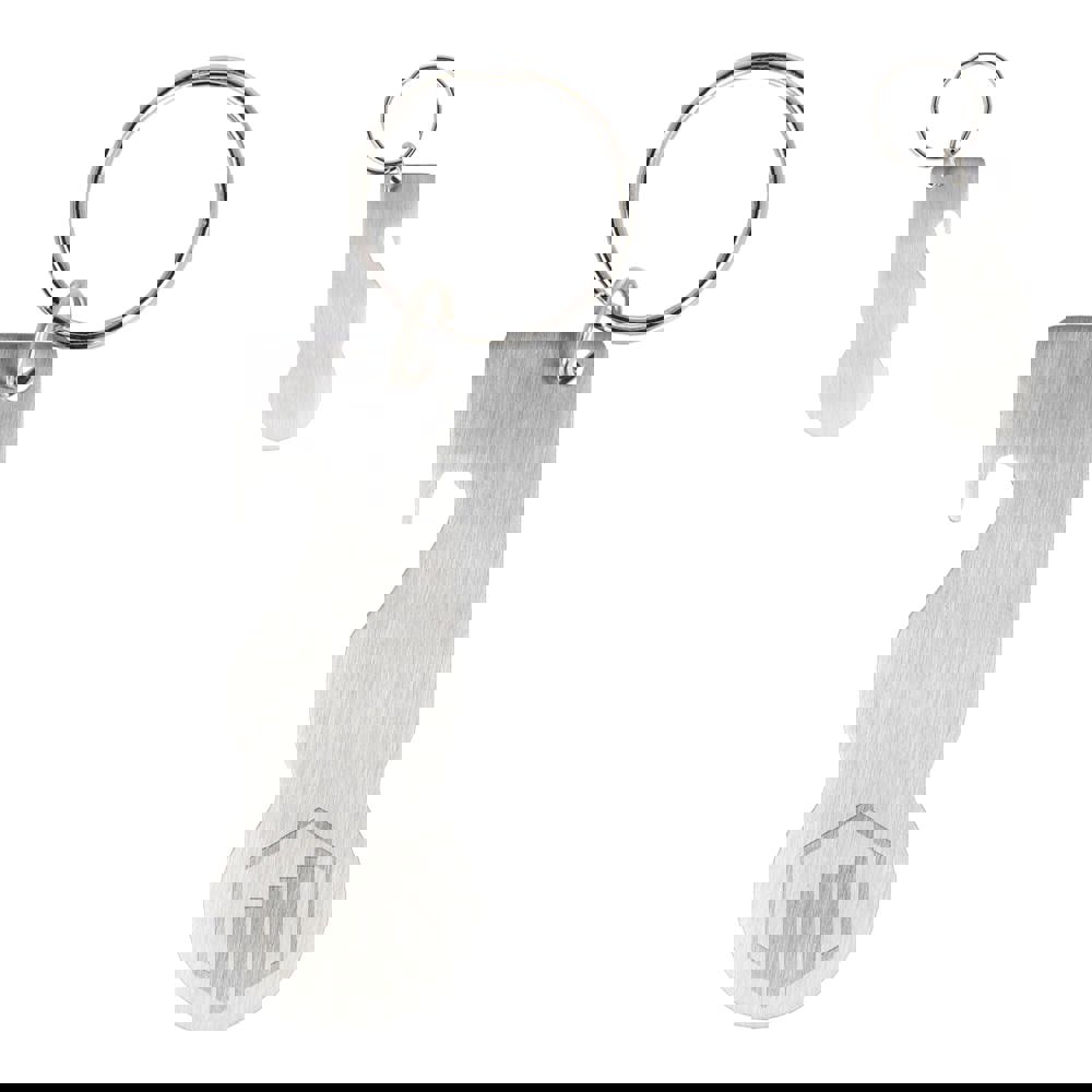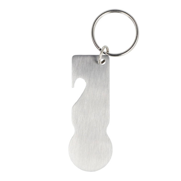 Roestvrijstalen sleutelhanger met geïntegreerde flesopener en winkelwagenmunt, geschikt voor de meeste winkelwagens in West-Europa. Muntkop van 23 mm. Praktisch ontwerp met ruime mogelijkheden voor branding.