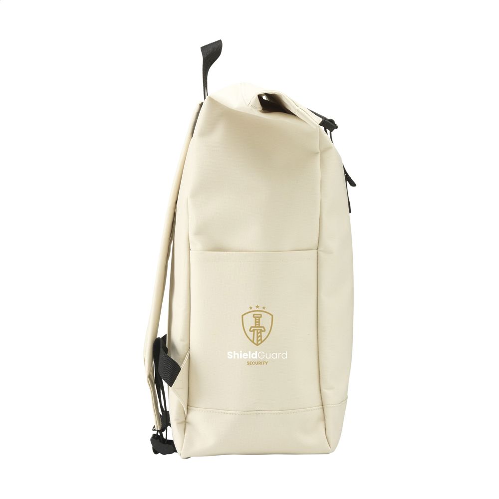 Stoere, praktische urban ‘roll-top’ rugzak van sterk 600D polyester met waterbestendige PVC binnenzijde, gedeeltelijk nylon gevoerd. De rugzak heeft één groot binnenvak, een insteekvak aan beide zijdes en een groot ritsvak aan de voorzijde. Met foam rugzijde voor meer draagcomfort, gewatteerde, en verstelbare schouderriemen. Met draaglus en een rolsluiting met kliksysteem aan de bovenzijde. De perfecte tas voor dagelijks gebruik. Inhoud ca. 18 liter.