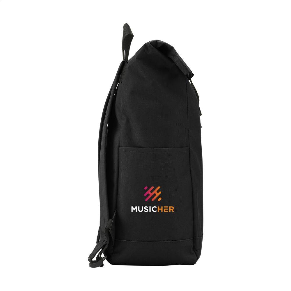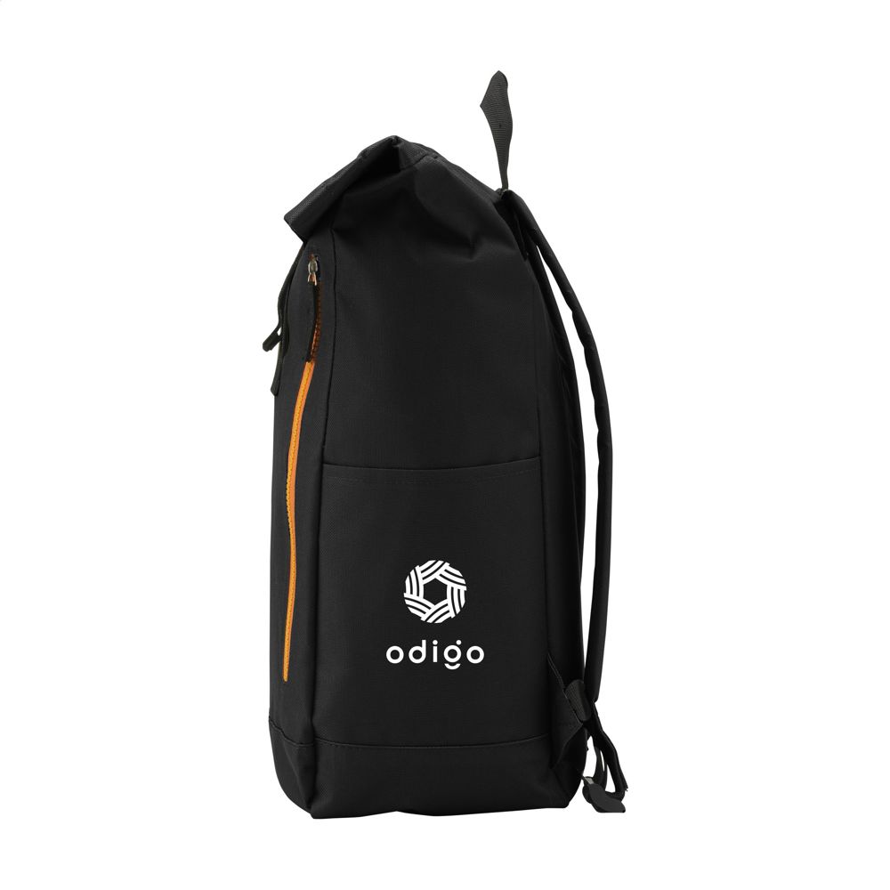 Stoere, praktische urban ‘roll-top’ rugzak van sterk 600D polyester met waterbestendige PVC binnenzijde, gedeeltelijk nylon gevoerd. De rugzak heeft één groot binnenvak, een insteekvak aan beide zijdes en een groot ritsvak aan de voorzijde. Met foam rugzijde voor meer draagcomfort, gewatteerde, en verstelbare schouderriemen. Met draaglus en een rolsluiting met kliksysteem aan de bovenzijde. De perfecte tas voor dagelijks gebruik. Inhoud ca. 18 liter.