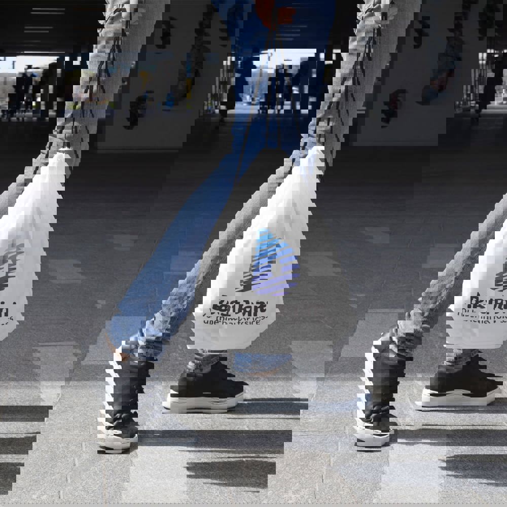 Polyester rugzak. Met trekkoord als sluiting.