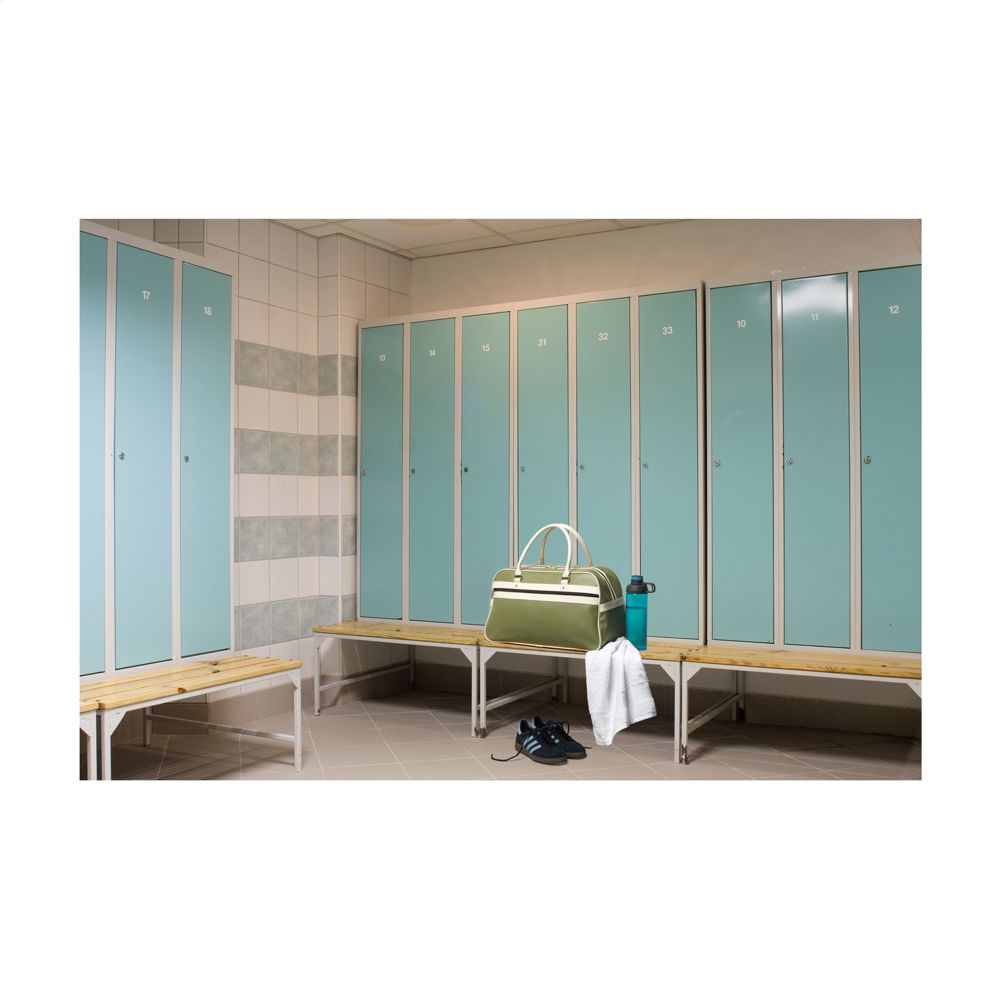 PVC/PU sporttas in jaren '70 look met gevoerde binnenzijde, hoofdvak en ritsvak, 2 stevige handgrepen, inlegbodem en beschermnoppen. Afgewerkt met hoogwaardige materialen die een lange levensduur garanderen. Inhoud ca. 21,5 liter.