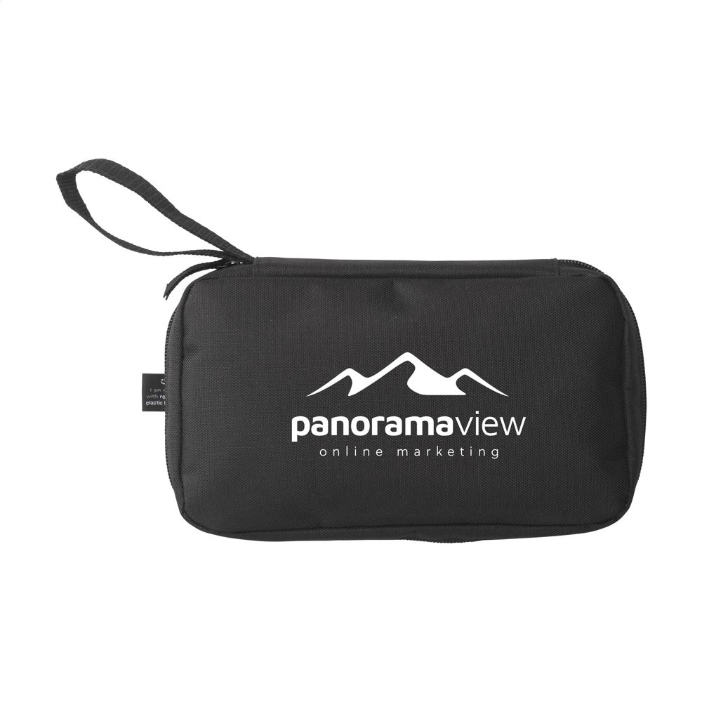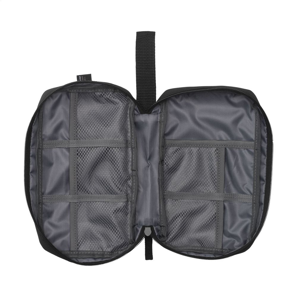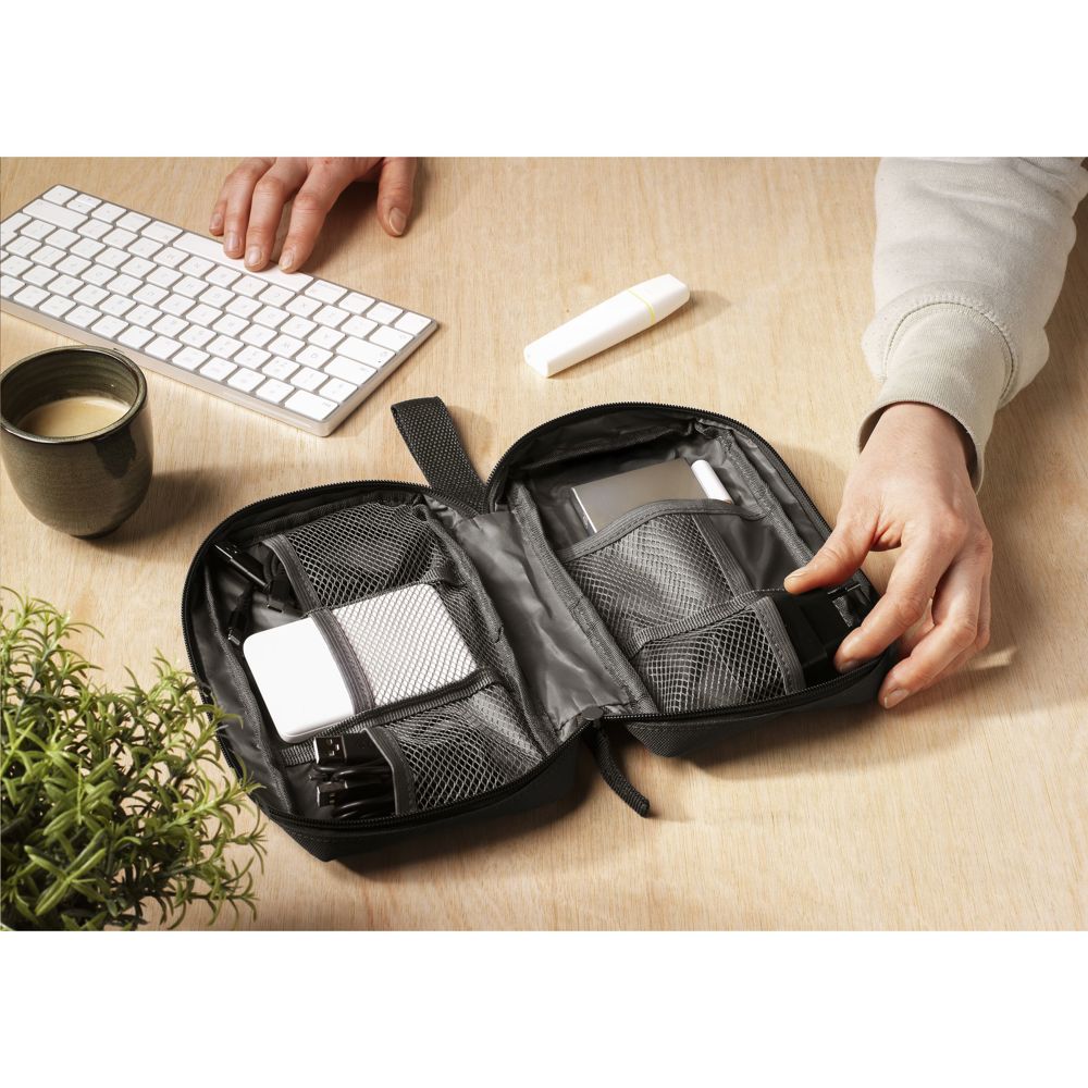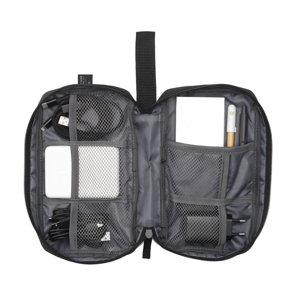 Etui voor het georganiseerd en overzichtelijk opbergen van kabels, opladers en technische accessoires. Gemaakt van 600D RPET polyester. De binnenzijde biedt ruime opbergmogelijkheden, verdeeld over verschillende (mesh) vakken. Met ritssluiting, een extra ritsvak aan de buitenzijde en een praktische draaglus. Ideaal om mee te nemen op reis, maar ook handig voor thuis of op kantoor. GRS-gecertificeerd. Totaal gerecycled materiaal: 88%.