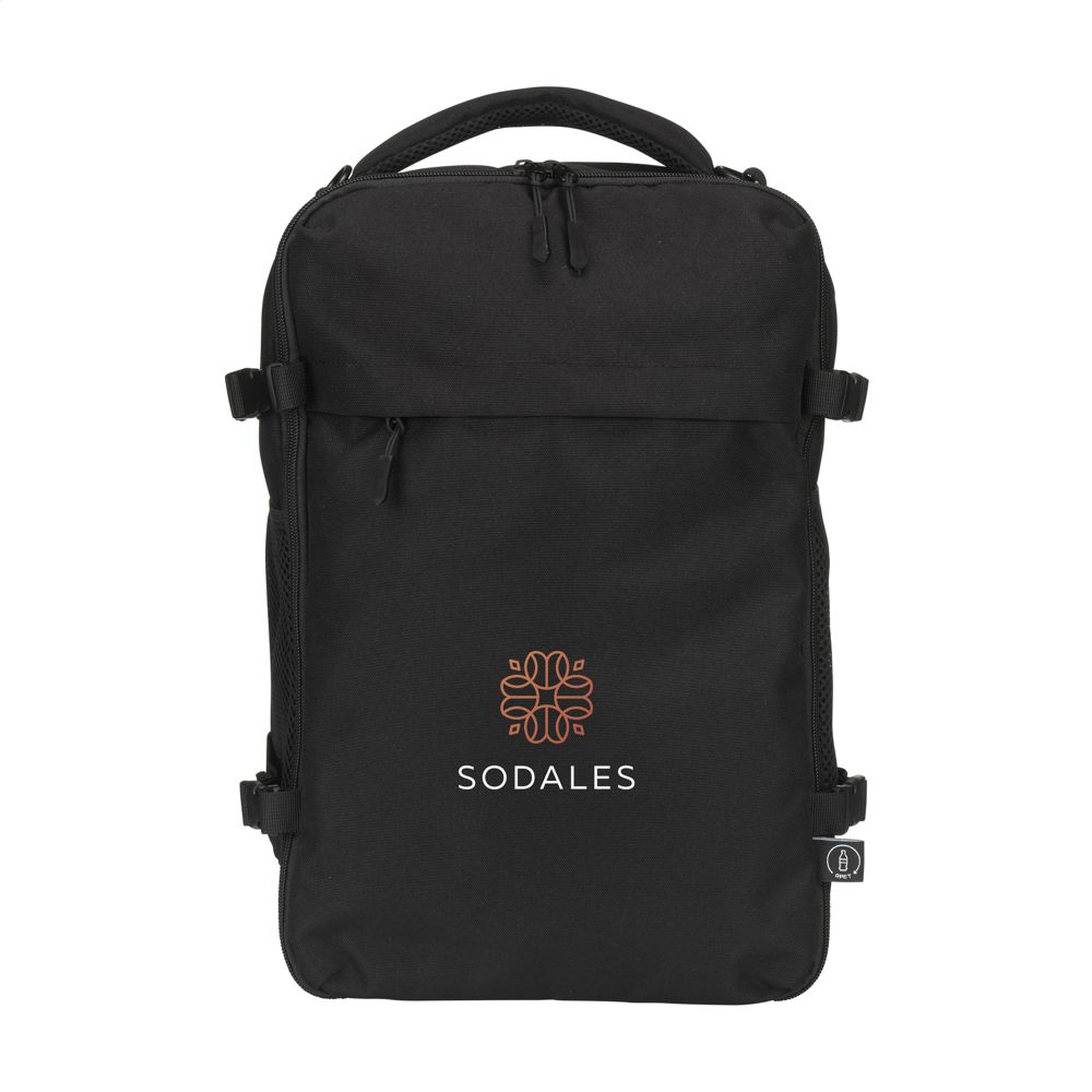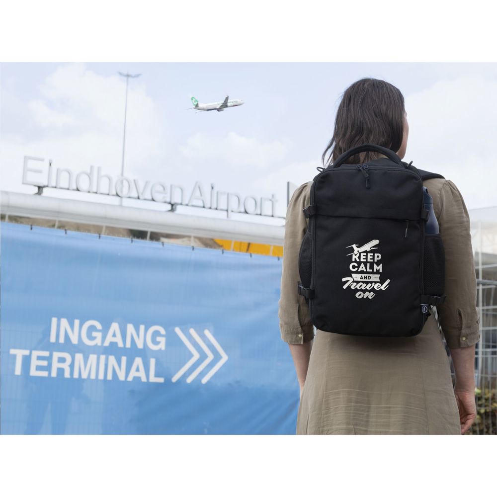 Deze compacte en veelzijdige Cabin Flight rugzak is ontworpen om als handbagage mee te nemen in het vliegtuig voor alle luchtvaartmaatschappijen. Hij past eenvoudig onder de stoel van elk vliegtuig. Met een inhoud van ca. 20 liter biedt de rugzak verrassend veel opbergruimte, terwijl het lichte gewicht het dragen comfortabel maakt. De buitenzijde is gemaakt van stevig gerecycled RPET 900D polyster. Geheel gevoerd met gerecycled RPET 210D polyester. Het ruime hoofdvak, met rits en dubbele ritstrekkers, is ideaal voor kleding en voorzien van een handige organiser voor telefoon, persoonlijke documenten en andere essentials. Een extra gewatteerd laptopvak biedt veilige bescherming voor laptops tot 15,6 inch. De tas heeft aan beide zijden elastische mesh pockets, ideaal voor een waterfles of kleine accessoires. In het achterpaneel bevindt zich een extra ritsvak. De schouderbanden zijn aan de bovenzijde in dit ritsvak bevestigd en aan de onderzijde met een karabijnhaak vastgeklikt. Door de haken los te maken, kunnen de banden volledig in het ritsvak worden opgeborgen, waardoor de tas nog compacter wordt. De verstelbare, gewatteerde schouderbanden, het gewatteerde rugpaneel en het stevige handvat met meshvoering zorgen voor optimaal draagcomfort, zelfs bij langere reizen. Inclusief afneembare schouderband. Een geïntegreerde trolleyriem maakt het eenvoudig de rugzak op een koffer te bevestigen. Deze rugzak is de perfecte reisgenoot voor elke vliegreis. GRS-gecertificeerd. Totaal gerecycled materiaal: 50%.