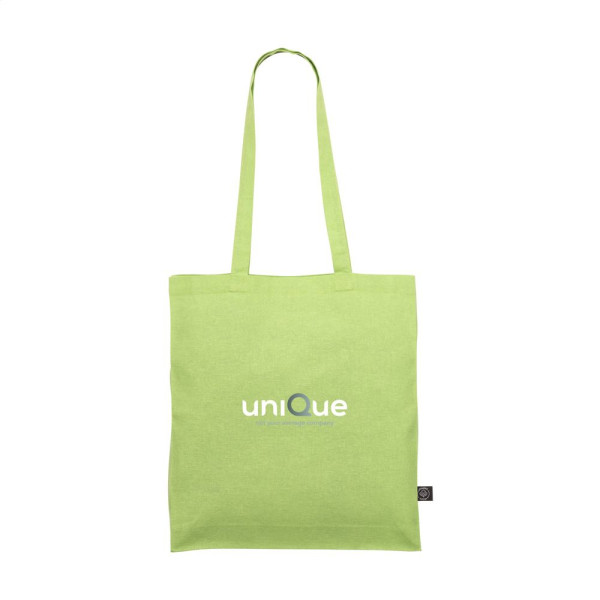 Stevige winkeltas met lange hengsels, van 80% gerecycled katoen en 20% gerecycled polyester (150 g/m²). GRS-gecertificeerd. Totaal gerecycled materiaal: 100%. Inhoud ca. 12 liter.