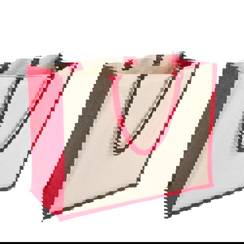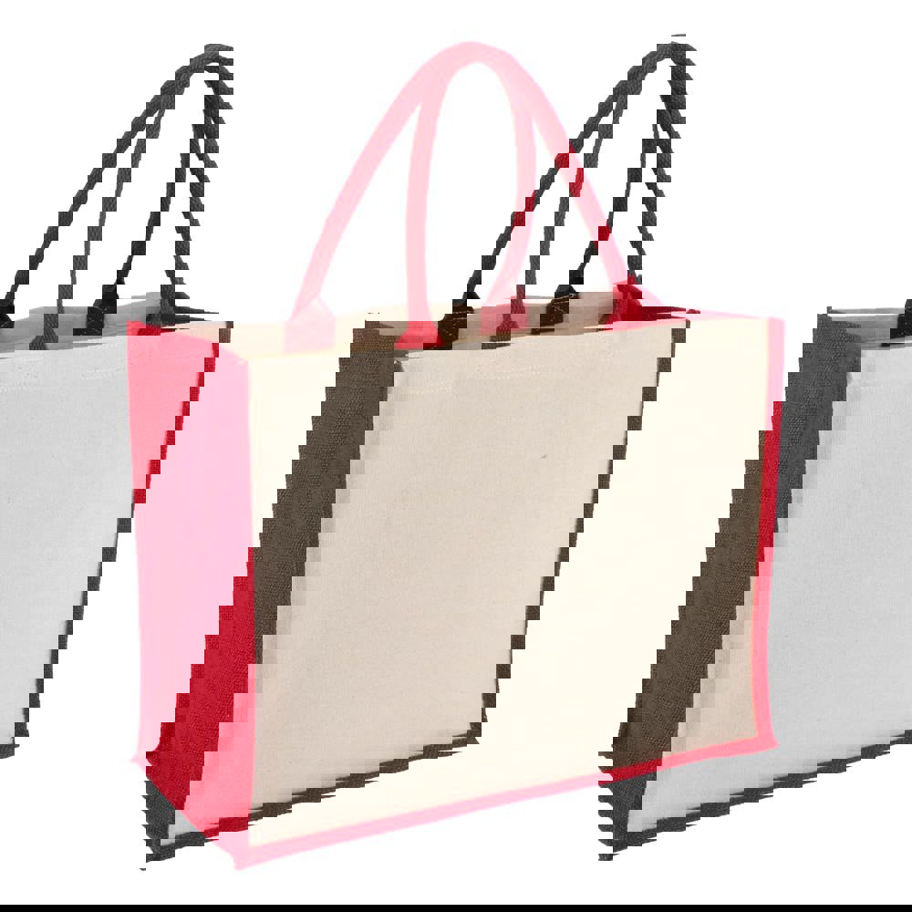 Stijlvolle tas met katoenen canvas voor- en achterpanelen en jute zijkanten en bodem – alles 320gsm. Afgewerkt met katoenen handvatten en zijkanten in accentkleuren voor een opvallende uitstraling. Oeko-Tex® gecertificeerd. Ideaal voor retail, events of dagelijks gebruik.