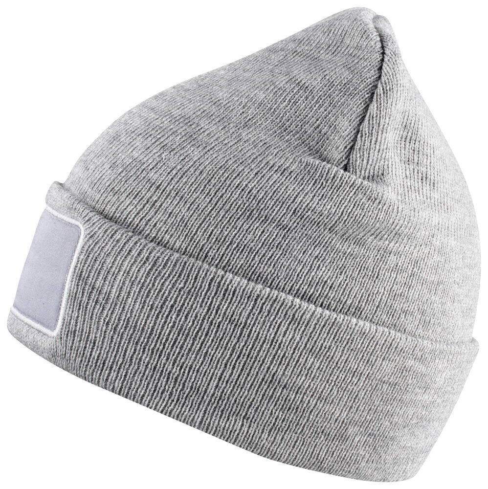 Klassieke, gebreide muts met een patch (9,5 x 4,5 cm) aan de voorzijde voor het gemakkelijk veredelen. De muts is voorzien van een omgevouwen rand voor een optimaal draagcomfort.