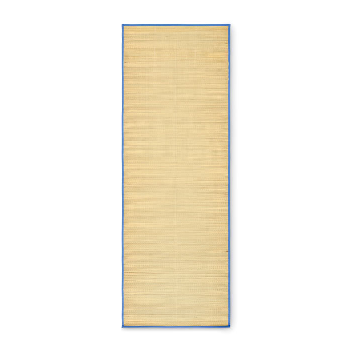Oprolbare strandmat van natuurlijk stro met polyester draagriem.