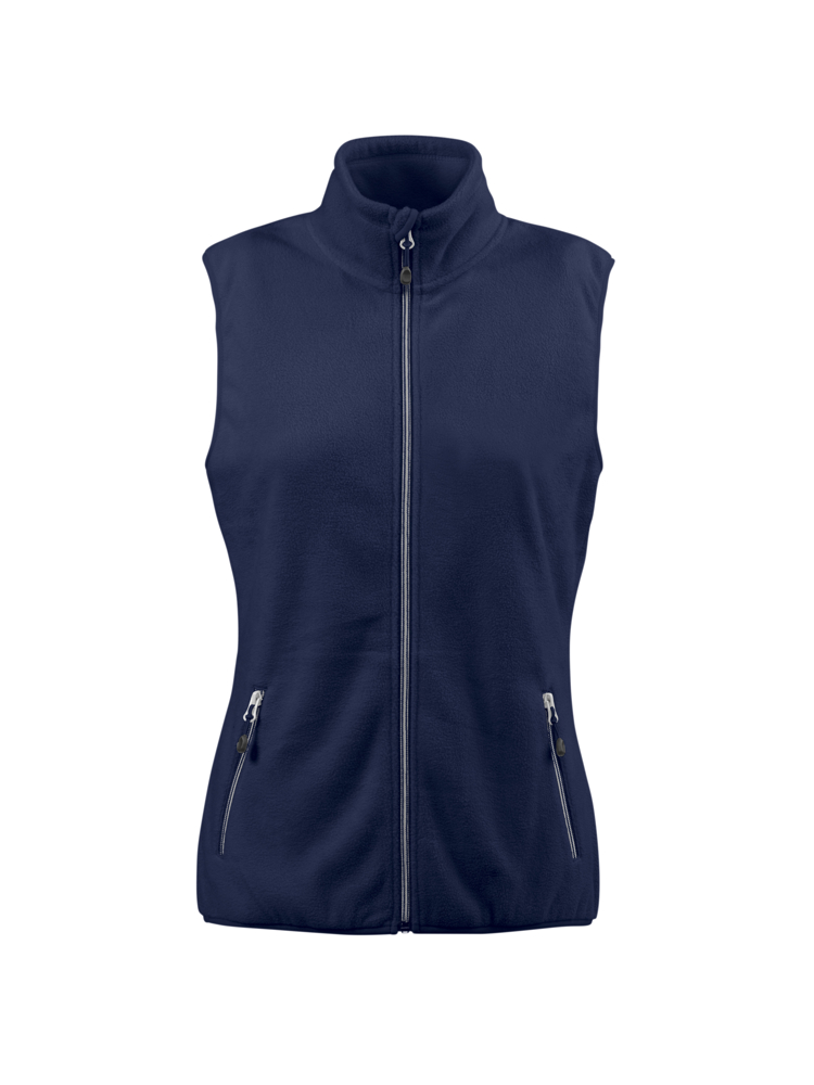 Geborstelde bodywarmer met lange ritssluiting voor dames en heren. Geborsteld aan beide zijden. Twee voorzakken, contrasterende ritssluitingen en decoratieve stiksels. Elastische tape aan de boord onderaan.