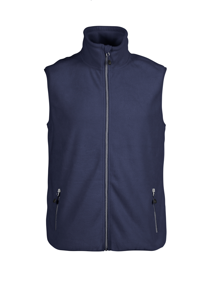 Geborstelde bodywarmer met lange ritssluiting voor dames en heren. Geborsteld aan beide zijden. Twee voorzakken, contrasterende ritssluitingen en decoratieve stiksels. Elastische tape aan de boord onderaan.