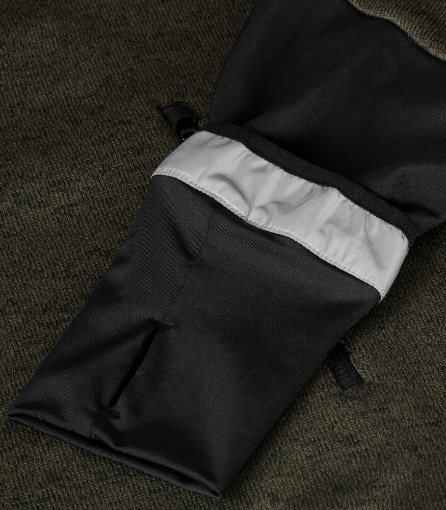 Een warm, gemakkelijk te dragen gebreid fleecejack met delen van softshell, drie zakken aan de buitenzijde met een ritssluiting en twee grote binnenzakken. De mouwen zijn afgewerkt met elastische manchetten met duimgaten en een opvouwbare reflecterende band. Voorzien van een eenvoudig te verwijderen label voor rebranding.