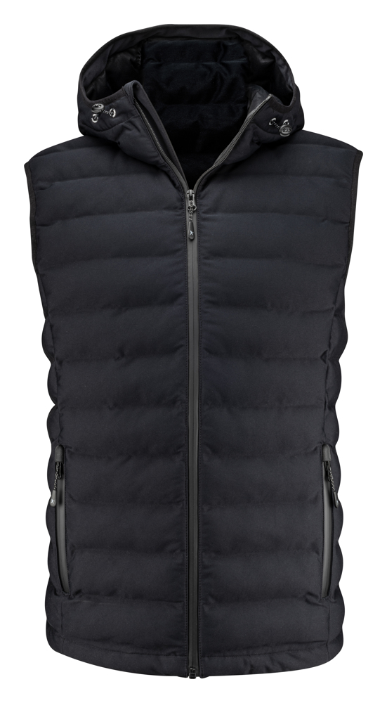 Gewatteerde bodywarmer. Waterdichte ritssluiting vooraan en aan de zijzakken. De zijzakken zijn aan de binnenzijde afgewerkt samen met de zoom zodat deze als binnenzakken gebruikt worden. Aanpasbare capuchon met elastische trekkoorden aan de zijden, afgewerkt met een elastische trekkoorden aan de zijden, afgewerkt met een elastische bies aan de zoom en aan de armsgaten.