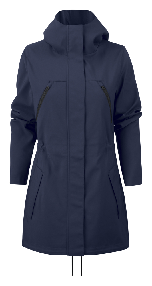 City coat met capuchon en verstelbare koord aan de taille (binnenzijde) en aan de boord onderaan. Matzwarte, metalen trekkoord aan de achterzijde aan de zoom onderaan. Lederachtige stoppers aan de taille.