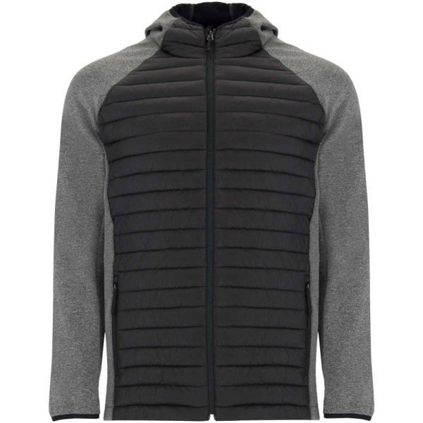 Herenjack met combinatie van twee stoffen. Vaste verstelbare capuchon. Raglanmouwen. Mouwen, zijpanelen en capuchon van softshell-stof. Gewatteerde, dons aanvoelende stof aan de voor- en achterkant. Omgekeerde rits met bijpassende kinbeschermer en trekker. Twee voorzakken met rits. Bijpassende elastische bies in kraag, manchetten en zoom. Verwijderbaar etiket. Winddicht model. Het mannelijke model is 184 cm en draagt maat L en het vrouwelijke model is 174 cm en draagt maat S.