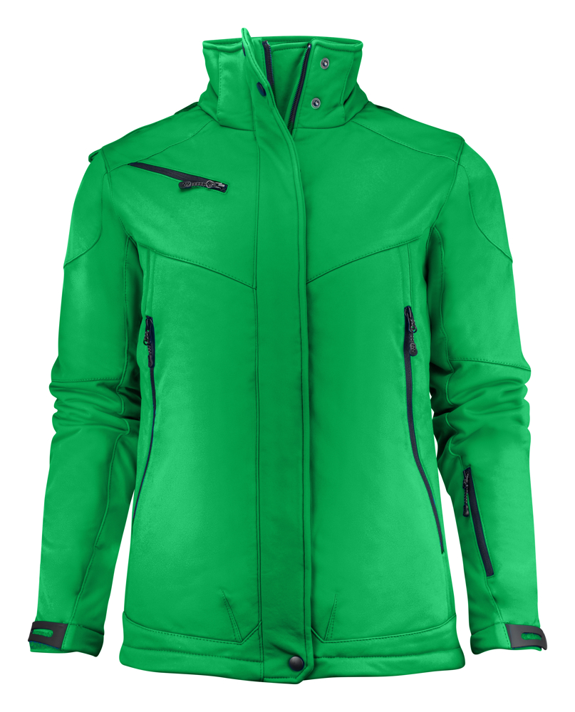 Gevoerde softshell met afneembare capuchon, voorgevormde mouwen en trekkoord onderaan de zoom. De mouwen zijn verstelbaar met een velcro. Voorzakken en borstzak met ritssluiting, twee binnenzakken met ritssluiting en een zak in membraanvoering.