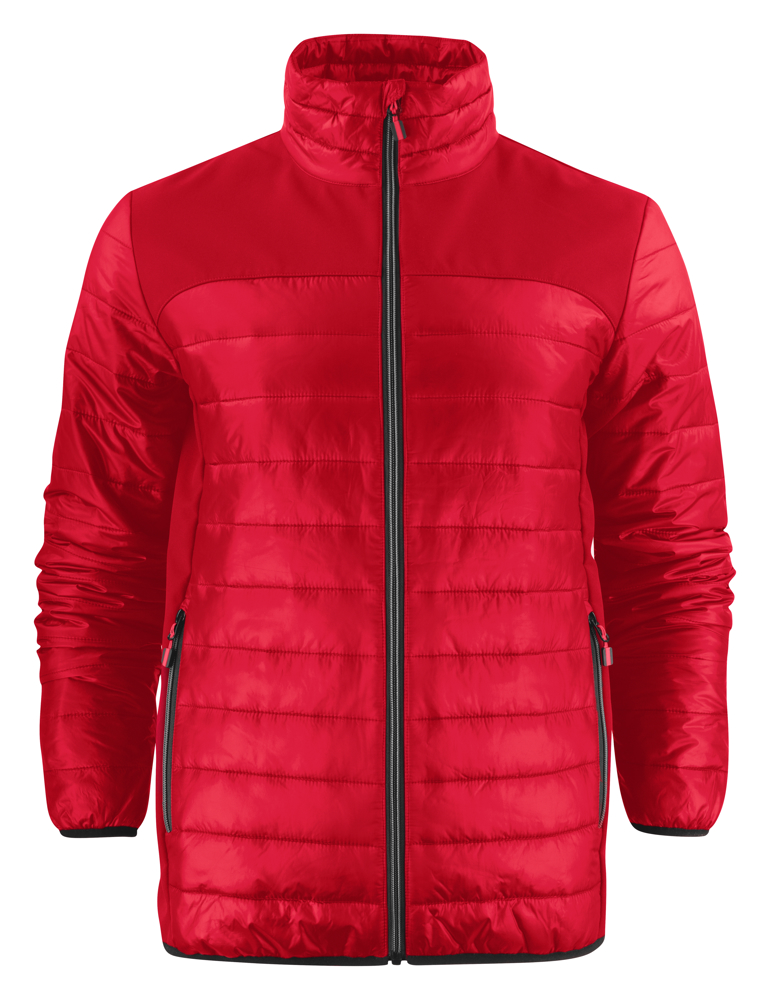Lichte jas in twee materialen: juk en zijpanelen in softshell en body (voor-en achterzijde) en mouwen in lichtgewatteerd taffeta materiaal. Contrasterende ritssluiting. De zippullers kunnen indien gewenst vervangen worden door één van de andere beschikbare kleuren.