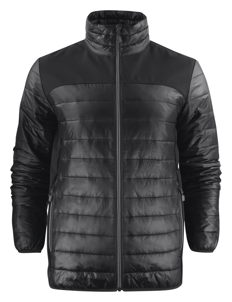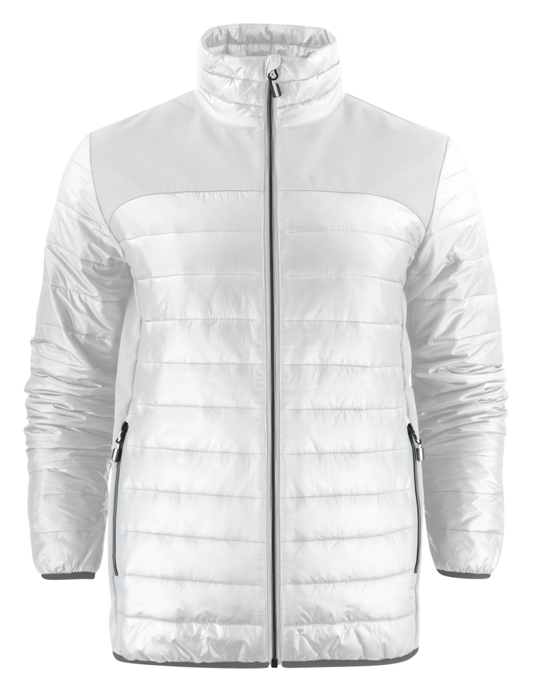 Lichte jas in twee materialen: juk en zijpanelen in softshell en body (voor-en achterzijde) en mouwen in lichtgewatteerd taffeta materiaal. Contrasterende ritssluiting. De zippullers kunnen indien gewenst vervangen worden door één van de andere beschikbare kleuren.