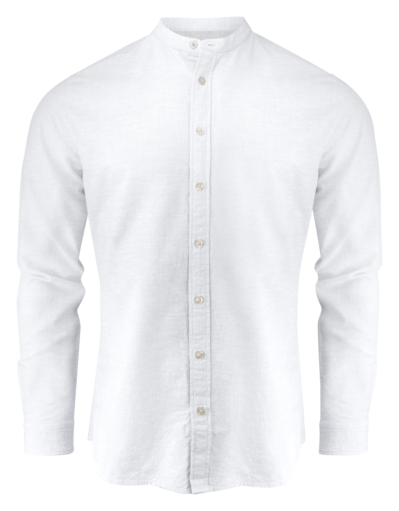 Linnenblend hemd met Mao kraag en aanpasbare manchetten. Parelmoer knopen. Contraststof aan de binnenkant van de schouderpas en manchetten. Garen geverfd.