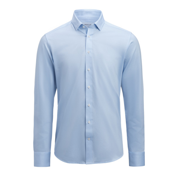 De King Knit-techniek geeft dit shirt een mooie textuur en natuurlijke stretch. De stof is Easy-Care behandeld en gemaakt van een mix van duurzame materialen. De witte optie is effen, terwijl de textuur goed zichtbaar is in de lichtblauwe en groene opties. De totale lengte is 3 cm korter.