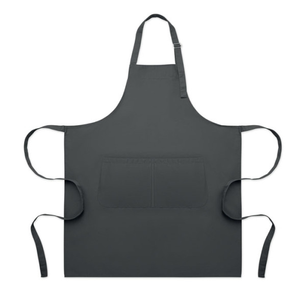 Lang, verstelbaar keukenschort van 240g/m² polykatoen (35% katoen, 65% polyester) met twee voorzakken en verstelbare riem met metalen gesp.