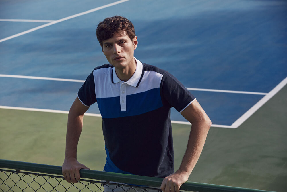 Moderne polo met contrasterende panelen en details in de kraag en bij de mouwen. Hoogwaardig afgewerkt met zijsplitjes en drie ton sur ton knopen. Verder voorzien van verstevigde necktape en een gemakkelijk te verwijderen label voor rebranding.