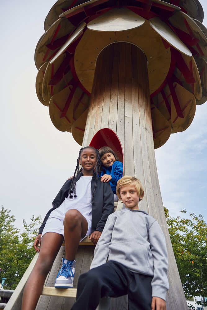 Spun Dyed sweater met capuchon en buidelzak voor kinderen. Afgewerkt met een visgraat necktape, boorden aan de mouw en de zoom van dezelfde stof, een doorvoer voor koptelefoon en een eenvoudig te verwijderen label. De sweater is niet voorzien van een trekkoord in de capuchon voor betere kinderveiligheid.