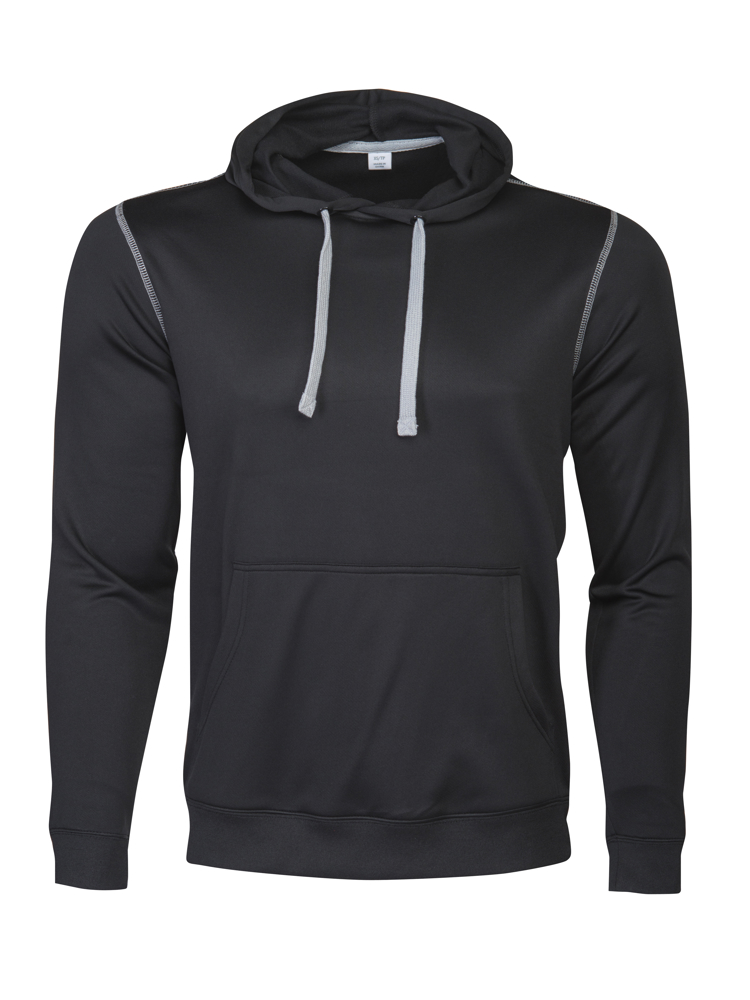 Polyester sweatshirt met capuchon. Contrasterende flatlock naden aan de schouders en mouwopening. Binnenzijde is geborsteld voor een zacht en warm gevoel. Ook verkrijgbaar in kindermaten.