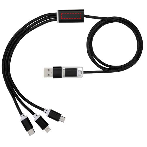 Gevlochten nylon oplaadkabel met vijf verschillende connectoren: Type C ingang, USB A ingang, Type C uitgang, Apple® iOS uitgang en micro USB uitgang. Hierdoor kan de kabel ook worden gebruikt met Type C uitvoerapparaten die zijn opgenomen in de nieuwere generatie telefoons en MacBook computers. Kabellengte is 100 cm. 2 in 1 uiteinde met uitgang tot 2A. Type C uitgang tot 3A stroom.