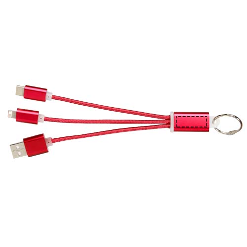 Metalen 3-in-1 oplaadkabel met sleutelring. De metalen 3-in-1 oplaadkabel met sleutelring beschikt over 1 type C, 1 USB type A en een 2-in-1 dubbel uiteinde dat compatibel is voor zowel Apple iOS als Android apparaten. Wordt geleverd met een sleutelhanger. Om Apple apparaten op te laden steekt u het kabeluiteinde zonder pinnen in het apparaat, en voor het opladen van Android apparaten steekt u het uiteinde met pinnen in het apparaat.