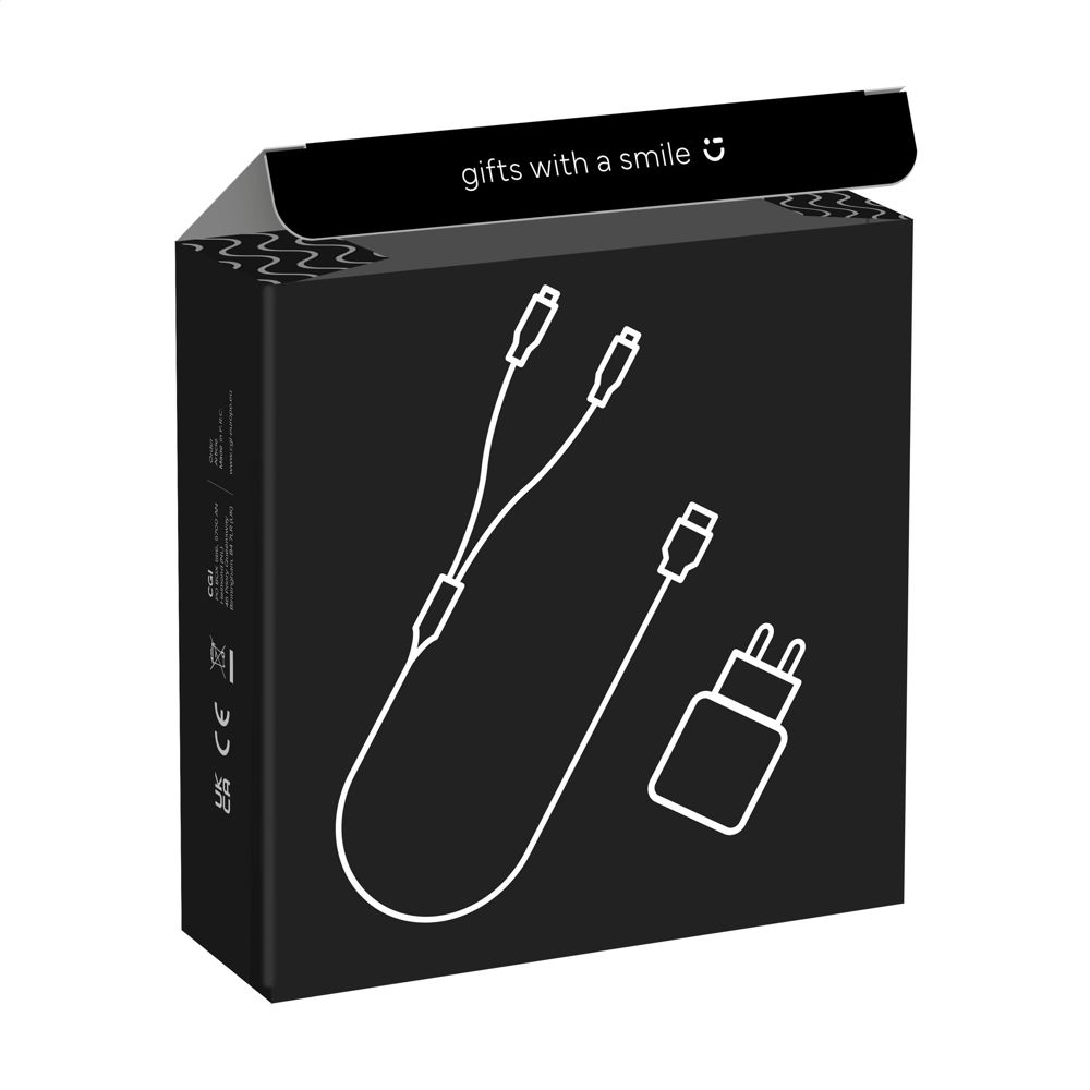 Oplaadset: Wandoplader van gerecycled PC. Met 2 Type-C poorten en een oplaadkabel. De kabel is gemaakt van gerecycled TPE, gerecycled PET en gerecycled aluminium alloy. Lengte kabel 120 cm. Ingang: Type-C en USB-A-connector. Uitgang: Type-C en Lightning. Per set in pouch van gerecycled PU. Ideaal als reisset. RCS-gecertificeerd. Totaal gerecycled materiaal: 45%. Per stuk verpakt.
