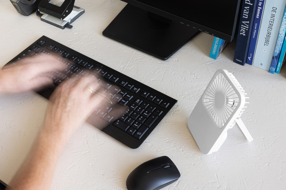De Aervina bureauventilator, gemaakt van RCS-gecertificeerd gerecycled plastic, is een slanke en praktische manier om thuis of op kantoor van een verfrissende bries te genieten.Het moderne zwarte ontwerp combineert stijl met functionaliteit.De oplaadbare 1200 mAh Li-ionbatterij biedt tot 3 uur werktijd en kan in 4 uur worden opgeladen via de meegeleverde 120 cm zwarte TPE USB-A naar USB-C-kabel.Met drie instelbare snelheidsniveaus en een verstelbare standaard biedt de Aervina ventilator flexibel comfort waar je het nodig hebt.Gemaakt van RCS-gecertificeerd gerecycled ABS-plastic.RCS (Recycled Claim Standard) is een standaard om het gerecyclede gehalte van een product te verifiëren door de hele toeleveringsketen heen.Totaal gerecycled materiaal: 58% op basis van het totale productgewicht.Deze ventilator is PVC-vrij en verpakt in een FSC®-gecertificeerde kraftdoos.Max. vermogen: 5W | Input: 5V/400mA.