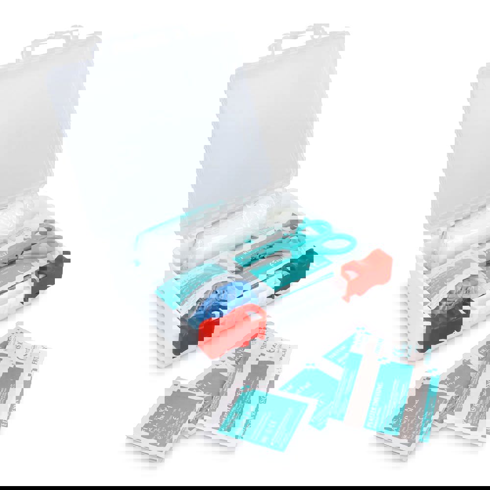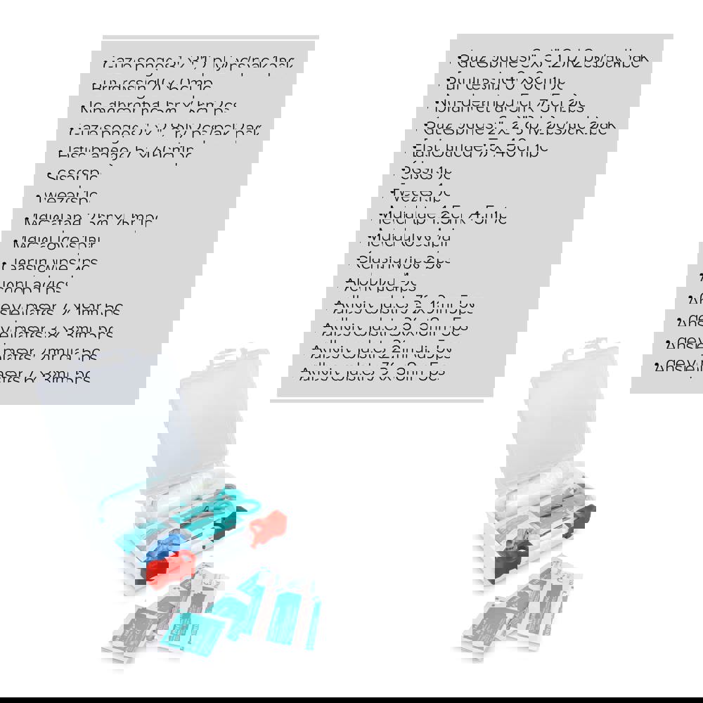 Uitgebreide EHBO set in stevige PP-doosje, voldoet aan Europese normen. Geschikt voor thuis, kantoor, reizen of outdoor-activiteiten. Bevat materialen voor wondzorg, brandwonden en kleine verwondingen. Inhoud: 1 × gauze sponzen 3" × 3" 12-laags (2 stuks/pack), 1 × burn dressing 40 × 60 cm, 2 × non-adherente pads 5 × 7.5 cm, 2 × gauze sponzen 2" × 2" 8-laags (2 stuks/pack), 1 × elastisch verband 7.5 × 450 cm, 1 × schaar, 1 × pincet, 1 × medische tape 1.25 × 4.5 m, 1 × medische handschoenen (2 stuks), 2 × reinigingsdoekjes, 4 × alcoholpads, 5 × pleisters 72 × 19 mm, 5 × pleisters 38 × 38 mm, 5 × pleisters 22 mm dia., 5 × pleisters 76 × 38 mm.